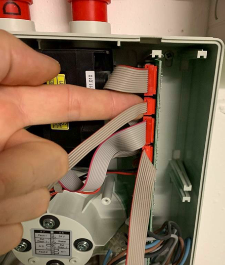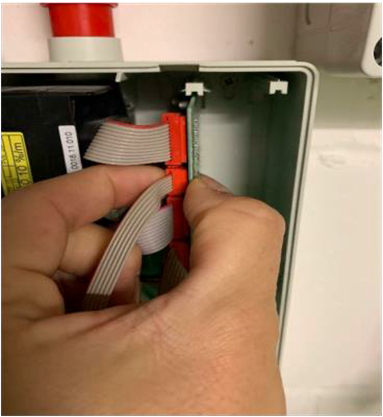 4. Push and hold the red connector end of the lead to the board whilst you open the software (as shown in image below), if the unit connects there is a loose connection with the ribbon cable and this should be replaced.