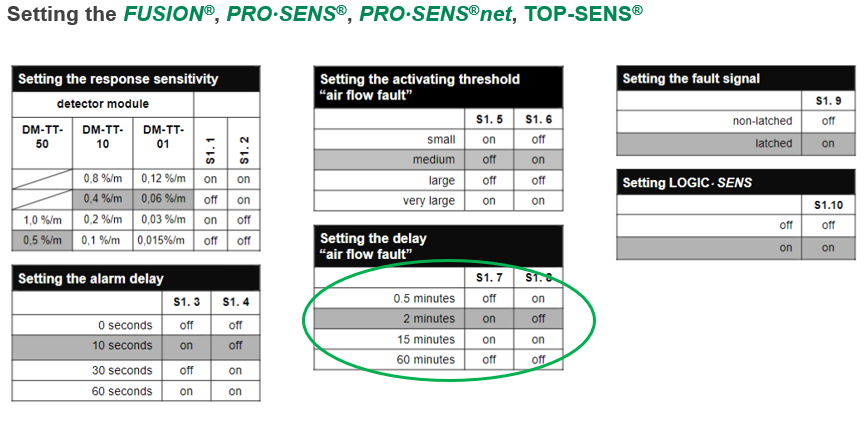 The greyed-out settings on the detector unit are the default setting when leaving the factory. Switches should be set to the same as the detector unit being removed. As this will have been installed and commissioned to the correct setting for the system installed to :-