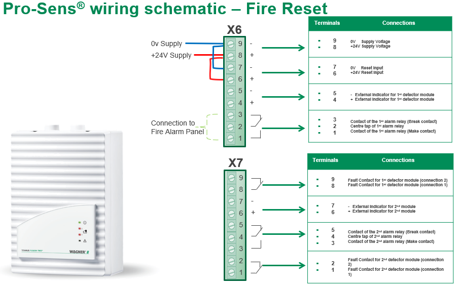 If you require an automatic reset on your ProSens panel you need to wire from 9 to 7 and 8 to 6 as shown in diagram below: